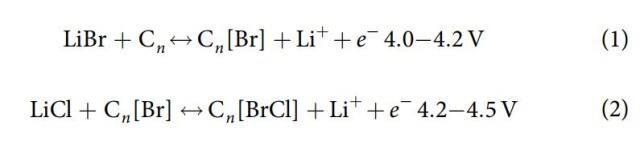 之后,電池放電過程中,石墨負(fù)極的碳層之間的金屬鋰釋放電子,變成鋰離子。同時電子也在放電過程中,通過外部電路從負(fù)極到達(dá)正極,溴、氯原子得到電子,分別變成溴離子和氯離子。此時,water-in-salt電解質(zhì)阻擋住流動的溴和氯離子移動,重新在正極內(nèi)生成固體鹽顆粒,直到下一輪充電。