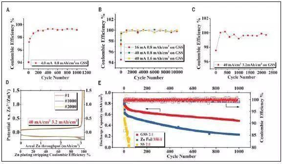 文章以鋅金屬負(fù)極為示例,實(shí)驗(yàn)結(jié)果顯示,鋅沉積/溶解的可逆性達(dá)到了99.9%,循環(huán)壽命是傳統(tǒng)鋅電極的100倍。