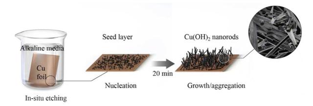 相比于金屬氧化物,金屬氫氧化物通常能夠提供更高的容量,因此近年來金屬氫氧化物的研究得到了較多的關注。Cu(OH)2納米棒的合成方法如下圖所示,首先采用去離子水配置2.5M NaOH和0.125M (NH4)2S2O8的混合溶液,銅箔在乙醇中清洗干凈后放入到該混合溶液處理20min,在該過程中發生的反應如下式所示,經過20min的腐蝕,Cu箔表面生成了大量的Cu(OH)2納米棒,隨后銅箔經過乙醇和去離子水清洗后進行常溫干燥。