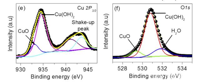 下圖a為處理后的Cu箔的XRD圖譜,從圖中能夠看到銅箔中主要存在Cu(OH)2和Cu兩種晶相。這一結果進一步被下圖b、c、d中所示的拉曼光譜數據所證實。比表面測試發現該材料的比表面積達到了6.661m2/g,平均孔尺寸為92.71nm。為了分析Cu箔表面的化學狀態,作者進行了XPS分析,Cu 2p圖譜中在933.07eV和934.64eV存在兩個特征峰,分別對應CuO和Cu(OH)2,從O 1s圖譜中我們也進一步確認了這兩種物質的存在。