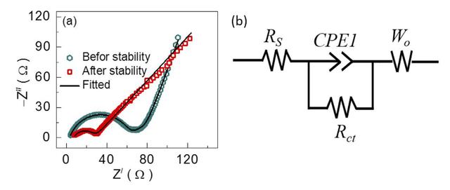 下圖為Cu(OH)2納米棒材料在循環前后的交流阻抗圖譜,作者根據下圖b中所示的等效電路對交流阻抗數據進行了擬合,擬合結果顯示循環前Cu(OH)2納米棒的電荷交換阻抗為56.75Ω,而循環后電荷交換阻抗降低到了21.05Ω,這可能是由于反復的循環過程中Cu(OH)2納米棒發生了顯著的結構變化。