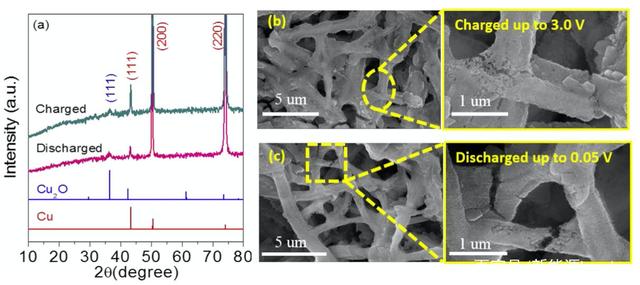下圖b和c為Cu(OH)2納米棒在充放電后的表面形貌,從圖中能夠看到在充電狀態下Cu(OH)2納米棒發生了顯著的體積膨脹和團聚,表面狀態非常粗糙。在放電狀態下,Cu(OH)2納米棒體積收縮,但是仍然存在由于體積膨脹產生的結構破壞,結構破壞造成了部分活性物質無法參與到充放電反應,從而造成了容量損失。