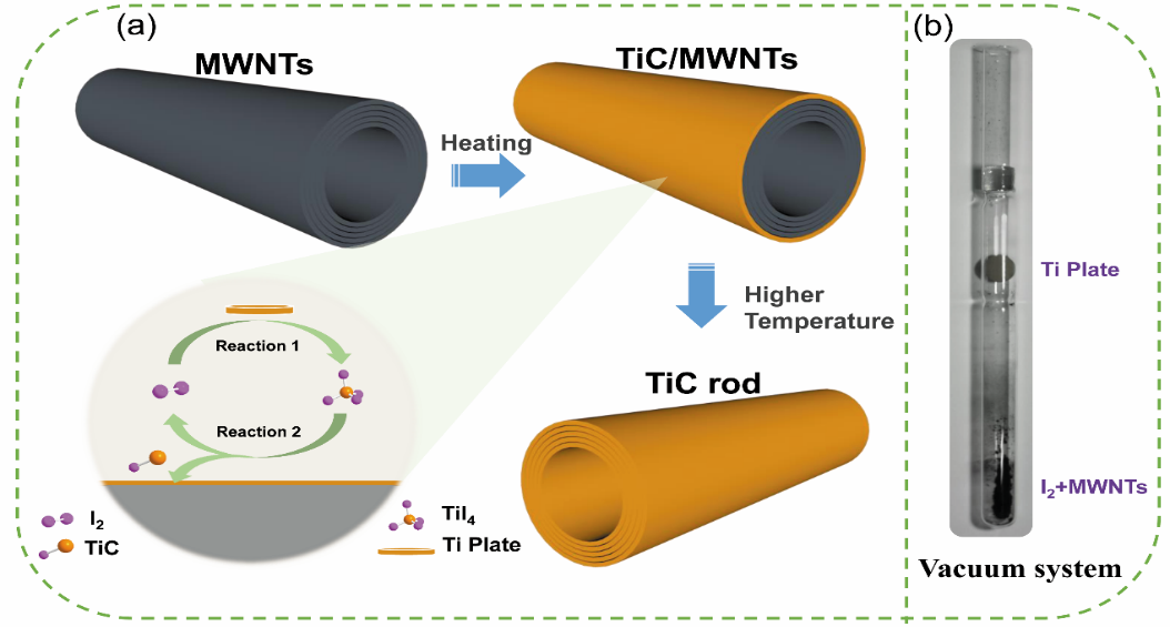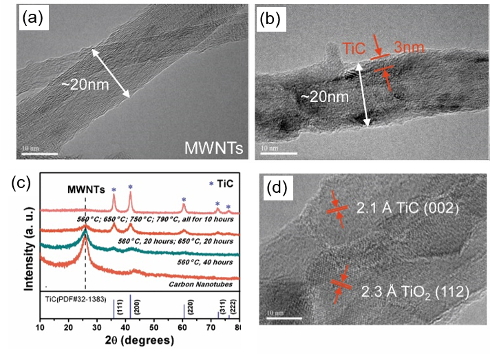 近日,中國(guó)科學(xué)院上海硅酸鹽研究所張濤研究員團(tuán)隊(duì)提出碳骨架和超薄非碳皮膚層相結(jié)合發(fā)展穩(wěn)定的碳基復(fù)合正極載體的思路。該研究團(tuán)隊(duì)以多壁碳納米管、金屬鈦粉和碘為原料,通過(guò)氣相外延生長(zhǎng)方法控制多壁碳納米管表面sp2雜化碳層的反應(yīng)程度,由外向內(nèi)地將碳納米管壁逐層轉(zhuǎn)化成TiC表面層。通過(guò)調(diào)節(jié)反應(yīng)溫度和時(shí)間,可以將表面層厚度精確控制在幾個(gè)納米到十納米范圍之內(nèi)。該方法具有普適性,可以拓展應(yīng)用于石墨烯和導(dǎo)電炭黑等碳材料。這種碳/非碳復(fù)合材料提高了鋰氧氣電池正極對(duì)于O2-的穩(wěn)定性,減少了副產(chǎn)物L(fēng)i2CO3的形成。在復(fù)合載體上負(fù)載Ru納米顆粒作為催化劑,電池表現(xiàn)出良好的循環(huán)穩(wěn)定性。相關(guān)工作以“Inward growth of superthin TiC skin on carbon nanotube framework as stable cathode support for Li-O2 bateries”為題發(fā)表在能源材料領(lǐng)域?qū)W術(shù)期刊Energy Storage Materials上(2020, DOI: 10.1016/j.ensm.2020.04.018)。論文第一作者為上海硅酸鹽所在讀博士生楊楚舒,導(dǎo)師為張濤研究員。