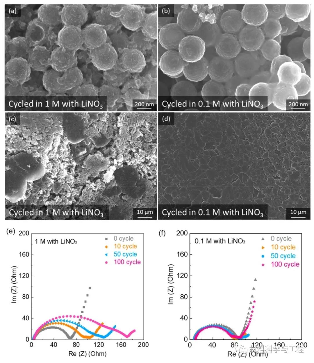 圖2 (a)-(b) CC-S電極分別在1 M和0.1 M電解質內循環200圈后的SEM照片;(c)-(d) 鋰片分別在1 M和0.1 M電解質內循環200圈后的SEM照片;(e)-(f) 電極分別在1 M和0.1 M電解質內循環前后的阻抗圖。
