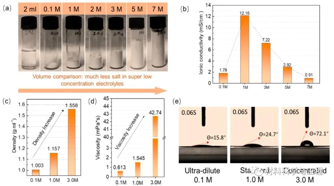 圖3 (a)2 ml溶劑和不同體積鋰鹽的照片和所對應的電解質濃度;(b)-(d)不同濃度電解質的離子電導率、密度和粘度;(e) 不同濃度電解質在CC-S電極上的接觸角的照片。