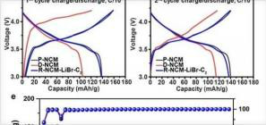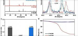 電池測試結果;c, d)P-NCM, D-NCM和R-NCM-LiBr-C2的全