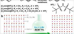 示意圖1. a)離子液體合成示意圖;b)離子熱鋰化策略修復三元正極材料的示意圖。
