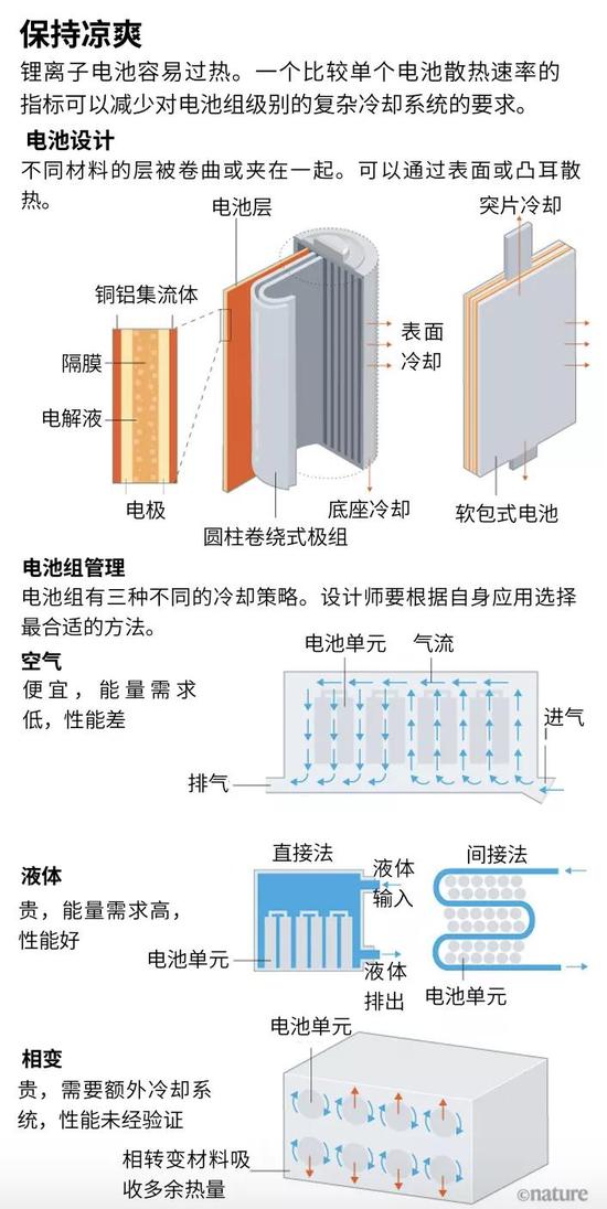 相變冷卻。一些材料,如美國3M科技公司生產的Novec流體,在從固體變為液體或從液體變為氣體時能夠吸收熱量,而不會自身變熱。電池可以浸入或涂上這種材料來吸熱。很多團隊都在研究這種方法,因為它比空氣或液體冷卻耗能更少,散熱更均勻。然而,這種方法有一個基本的限制。相變材料不會傳導熱量,他們只是把它儲存起來而已。因此,所有的相變設計都需要一個額外的冷卻系統來將熱量從電池組中帶走。