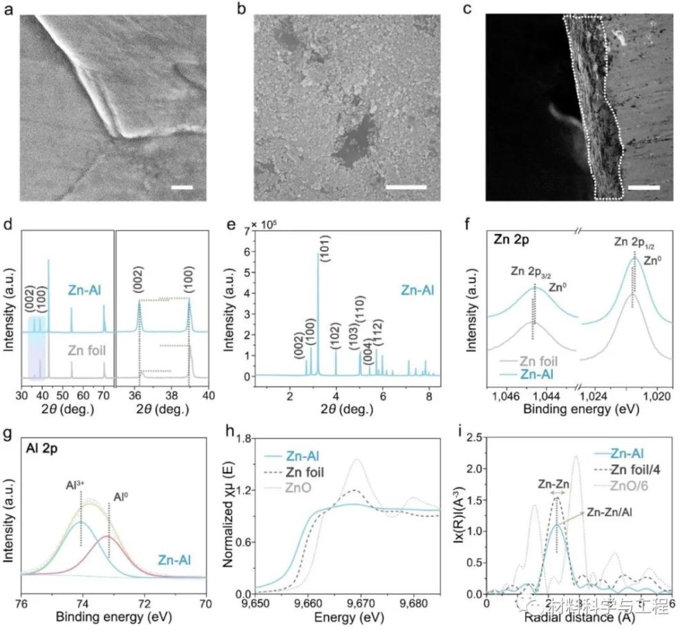 圖2 (a)-(c)鋅箔和Al-Zn合金的SEM圖;(d)-(i) Al-Zn合金的XRD圖、高能同步加速器XRD圖、XPS光譜圖XANES光譜圖和EXAFS光譜圖。