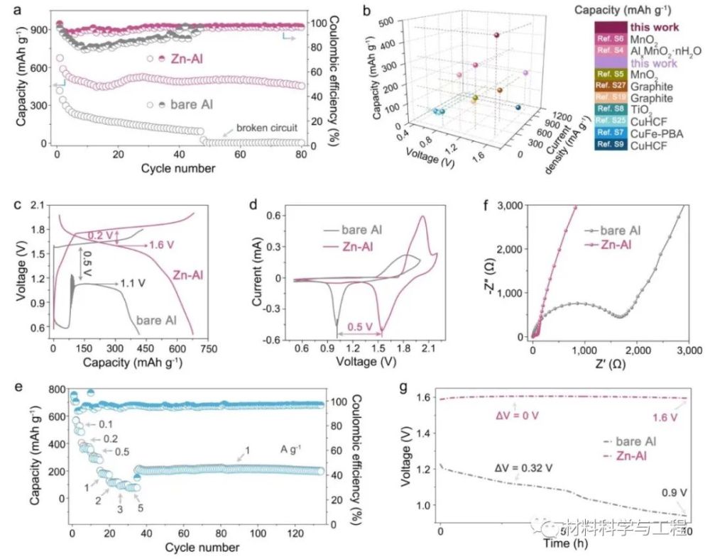 本文作者針對以上問題,利用MnO原位反應成AlxMnO2作為正極,并提出通過簡單地電鍍,制備Al-Zn合金作為AAIB負極材料。該方法僅在Zn箔上通過簡單地電鍍制成,并且Al負極中Zn元素的加入可以有效地抑制鈍化和自放電反應,并大大提高庫倫效率(通過抑制與氫氣的副反應)。并且由于Al3+較Zn2+的電位更低,在充放電過程中Al3+會形成一個正電荷靜電“盾”,抑制金屬枝晶的生長。種種優(yōu)勢也電化學測試中得到體現(xiàn):所制備的AAIB放電電壓高達1.6V,并在100 mA h g-1的電流密度循環(huán)80圈后比容量達到空前的460 mA h g-1,是迄今為止所報道的放電電壓比容量和最高AAIB電池。