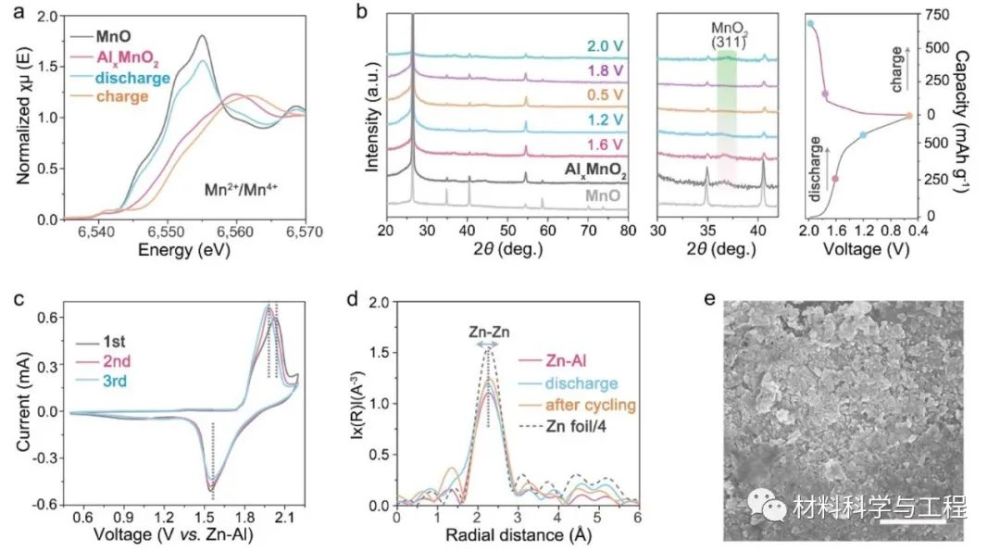 圖5 (a)充放電后AlxMnO2的XANES光譜圖;(b) AlxMnO2正極在第一次循環(huán)中的非原位XRD圖;(c) AAIB全電池的CV曲線圖;(d)-(e)循環(huán)后Al-Zn負極的EXAFS光譜圖和SEM圖。