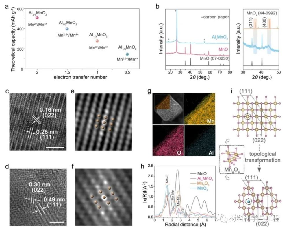 圖1 (a)不同錳氧化物還原的AlxMnO2的理論容量;(b) MnO和AlxMnO2的XRD圖;(c)-(f) MnO和AlxMnO2的HRTEM圖;(g) AlxMnO2的STEM圖和對應的元素映射圖;(h) MnO和AlxMnO2的EXAFS光譜圖;(i) MnO向AlxMnO2轉變的結構示意圖。