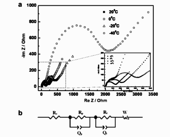 圖3 (a)在不同溫度下LiFePO4電極的EIS;(b)LiFePO4 EIS擬合的等效電路模型