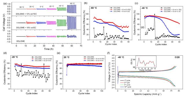 為了驗證碳酸酯類溶劑如何影響金屬鋰負極循環過程中的庫倫效率,作者采用Li/不銹鋼片電池在不同溫度下進行了循環,從下圖b-d可以看到在電解液中加入碳酸酯類溶劑后在-20℃以下時電池的庫倫效率相比于純的醚類溶劑都有顯著的提升。采用FEC添加劑的電解液,在-60℃下仍然能夠達到85%以上的初始庫倫效率,而純醚類溶劑電解液在此溫度下的庫倫效率僅為0-20%。在接近室溫的條件下,采用添加FEC的電解液在100次循環中庫倫效率平均為97.6%,而采用純醚類溶劑的電解液平均庫倫效率僅為96.3%。但是在60℃的高溫條件下,純醚類溶劑的電解液表現出了更好的庫倫效率,50次循環中平均達到98.7%,而添加FEC的電解液平均僅為95%,因此在醚類溶劑中添加部分的FEC后能夠改善鋰金屬電池的低溫循環性能。
