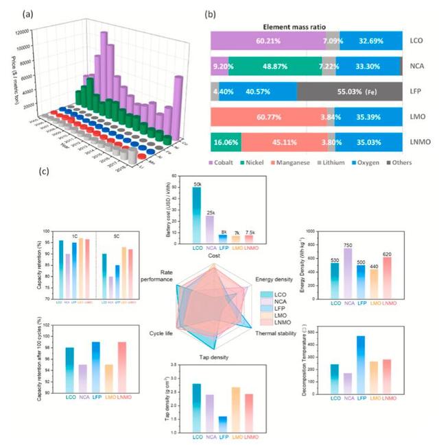 實現無Co化,降低材料的成本是近年來正極材料的發(fā)展趨勢,下圖中作者總結了近年來正極材料中常見元素的價格走勢,可以看到所有原材料中Co元素的價格最高,并且波動最大,近年來則價格大幅攀升。此外Ni和Li元素的價格相對較高,近年來也處于持續(xù)走高的趨勢。我們對比不同類型的正極材料可以看到,高電壓的LNMO材料,不僅具有高電壓(4.7V)和高能量密度的優(yōu)勢,同時其大量采用成本低廉的Mn元素,因此是一種理想的低成本,高能量密度材料。