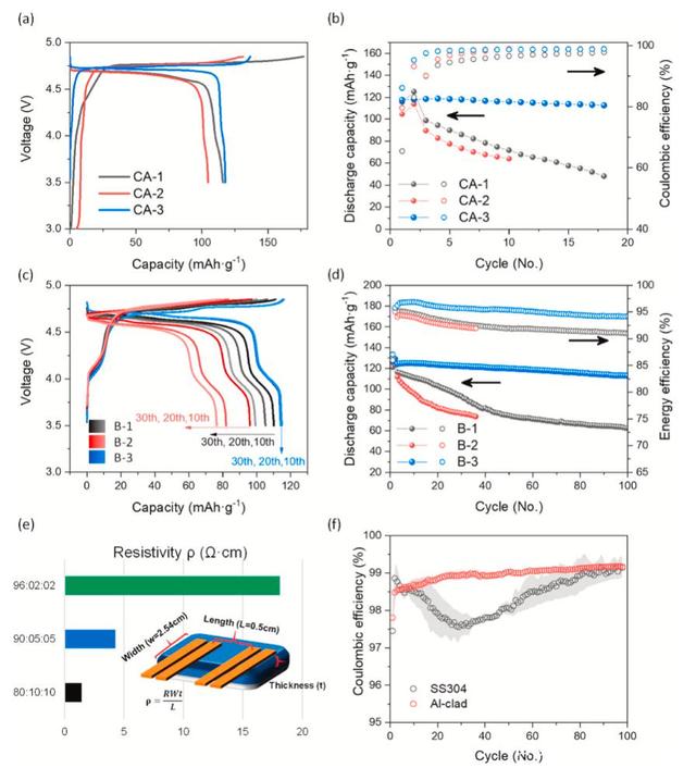 下圖e中作者采用四探針的方法分析了不同的導電劑配比下電極的電阻率,從圖中能夠看到活性物質的比例超過90%以后,電極的阻抗會出現顯著的增加,這會導致電池在工作過程中的極化顯著增加,因此在后續(xù)的測試中作者電極的配比為90:5:5。
