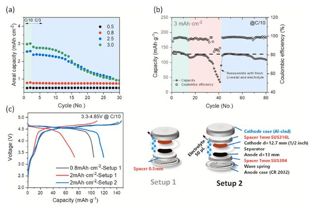 在下圖b中作者對3mAh/cm2的厚電極按照0.1C的倍率進行循環(huán),從圖中能夠看到前30次中電極的容量只有輕微的衰降,但是在30次以后開始快速衰降,但是當我們將循環(huán)衰降后的厚電極解剖出來,再次組裝為扣式電池,則其容量可以完全恢復,這表明厚電極在循環(huán)過程中的容量衰降更多的是來自金屬鋰負極的衰降和電解液的分解。