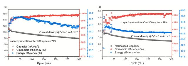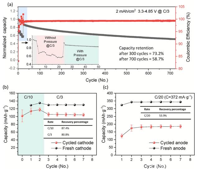 作者的實驗表明,通過對扣式電池的結構進行優(yōu)化,留出一定體積的氣室能夠有效的改善厚電極的電性能,但是扣式電池組裝的過程中內部電極所承受的壓力是不可測的。為了進一步分析壓力對于電極性能的影響,作者采用2mAh/cm2的厚電極與石墨負極組合為單層軟包電池。電池在前三次化成循環(huán)過程中,作者對電池施加了1100kPa的壓力,隨后拆除夾板循環(huán)20次,從圖中能夠看到電池容量快速降低到了初始容量的60%,庫倫效率也變的不穩(wěn)定,隨后作者又重新安裝夾板,施加壓力,可以看到電池的容量恢復到了初始容量的90%,電池的庫倫效率也變得穩(wěn)定,在經過700次循環(huán)后,電池的容量保持率為58.7%。
