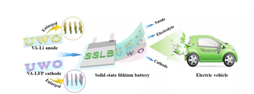 示意圖 1. 固態快充電池的組成示意圖(垂直結構金屬鋰負極VA-Li,垂直結構磷酸鐵鋰正極VA-LFP,聚合物基電解質)。