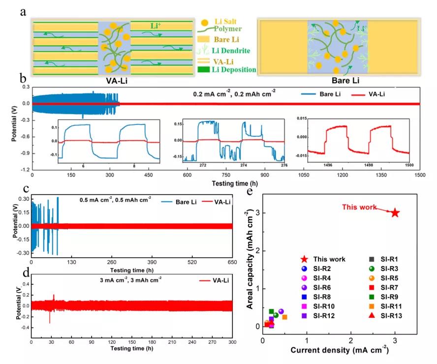 圖2. VA-Li與平面鋰對稱電池圖解(a),不同電流密度下循環性能對比(b~d),以及與其他聚合物基鋰對稱電池性能對比(e)。