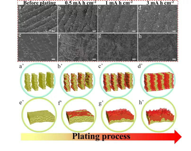 圖3. VA-Li(a~d)與平面鋰(e~h)在不同容量下的鋰沉積行為電鏡圖片,以及VA-Li(a’~d’)與平面鋰(e’~h’)對應的鋰沉積行為示意圖。