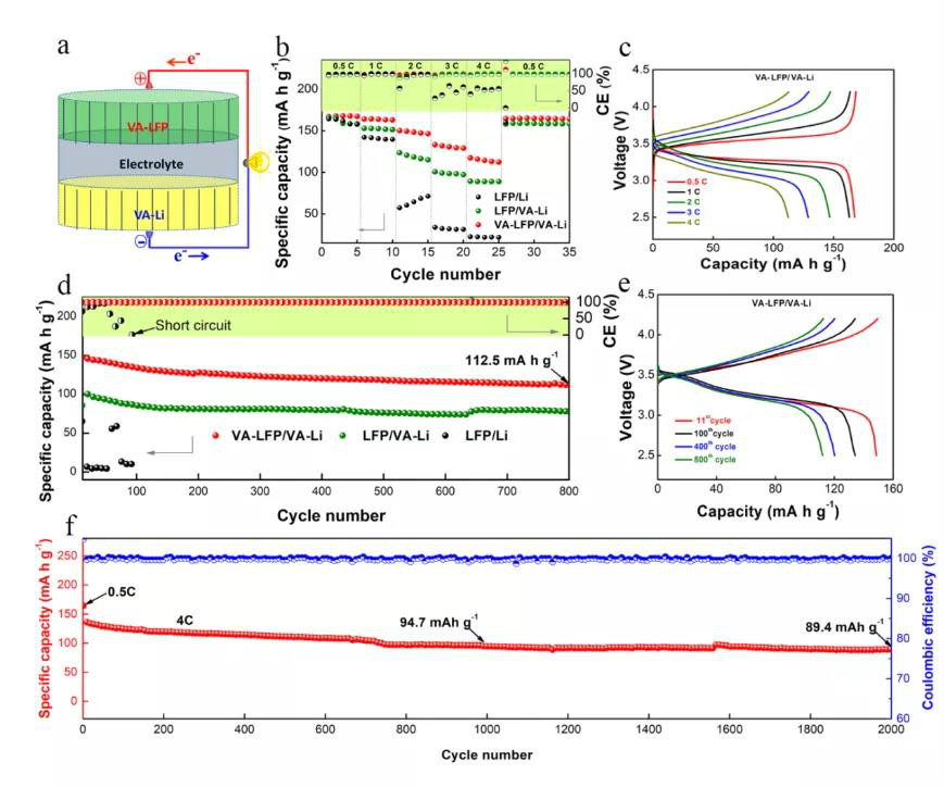 圖 4. 雙垂直電極與電解質組成全電池示意圖(a);三種不同固態電池(VA-LFP/VA-Li, LFP/VA-Li, LFP/Li)倍率性能(b)和VA-LFP/VA-Li在該倍率下的充放電曲線(c);三種不同固態電池在2C下的性能對比(d)及VA-LFP/VA-Li的充放電曲線;VA-LFP/VA-Li雙垂直結構電極在4C下的長壽命循環性能(f)。