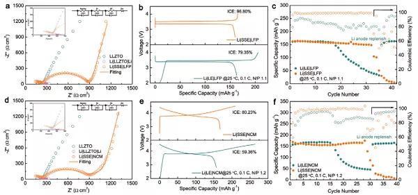圖3 低N/P比的液態鋰金屬電池和全固態鋰金屬電池的電化學性能。(a)LLZO, Li|LLZTO|Li和Li|SSE|LFP的EIS測試;(b)首次充放電曲線;(c)循環性能;(d)LLZO, Li|LLZTO|Li和Li|SSE|NCM的EIS圖;(e)首次充放電曲線;(f)循環性能。