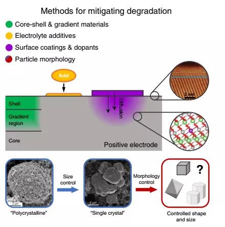 圖1.提高LiMO2正極循環(huán)壽命的潛在策略