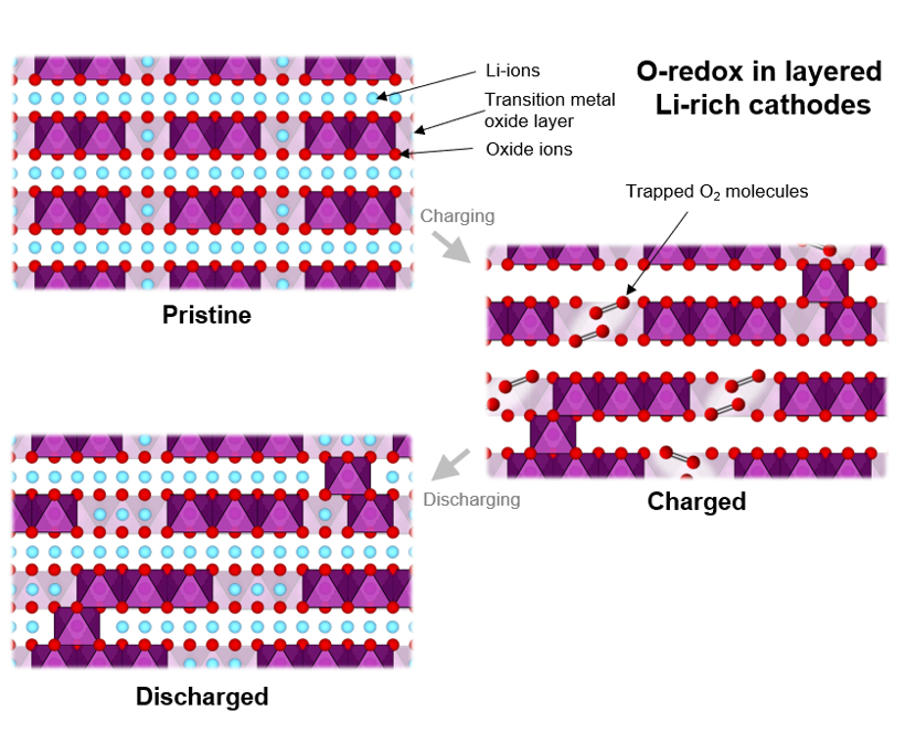 提升電動(dòng)汽車?yán)m(xù)航里程需要電池材料在較高的電壓下存儲(chǔ)更多的電荷,從而實(shí)現(xiàn)高“能量密度”。可增加鋰離子陰極材料能量密度的方法比較有限,如目前大多數(shù)陰極材料采用層狀過渡金屬氧化物,并添加鈷、鎳和錳。還有一種研究方法可將電荷存儲(chǔ)在氧化物離子以及過渡金屬離子上。
