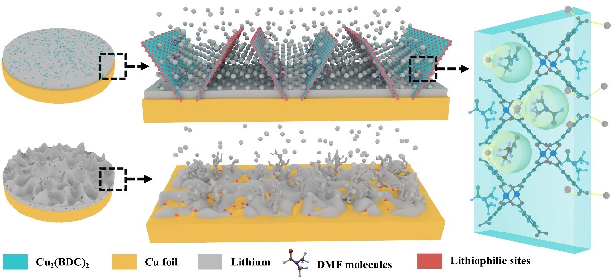 圖4. 原始Cu和OA-MOF/Cu電極上鋰沉積形貌和機理的對比示意圖