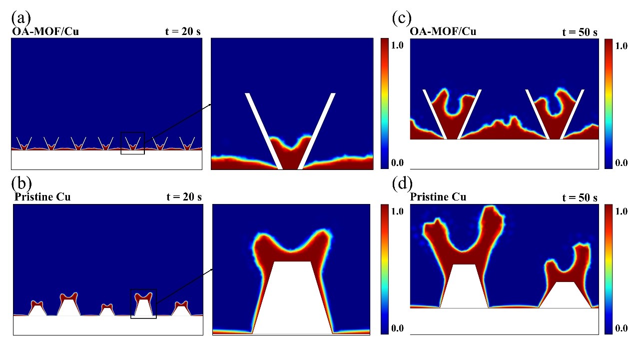 圖5. COMSOL模擬OA-MOF/Cu和原始Cu電極上不同時間段的鋰傳質生長