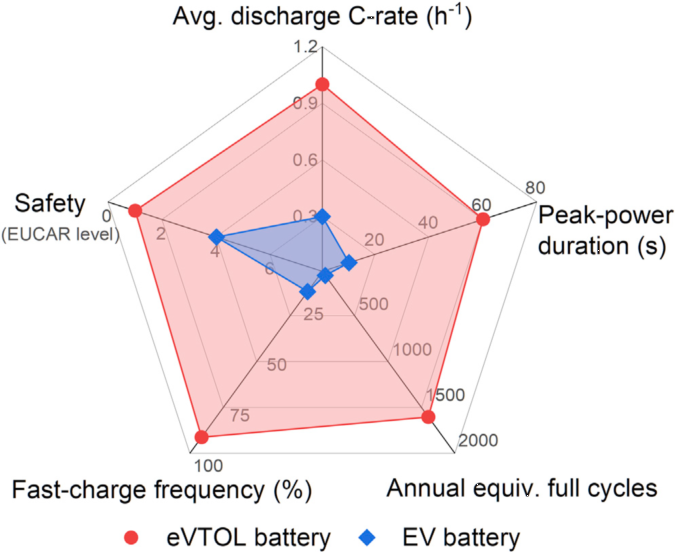 該研究詳細分析了飛行汽車對電池能量和功率密度、快充、壽命和安全性的要求。相比于傳統電動汽車電池,飛行汽車電池要求在更高的放電倍率下釋放更大的比能量,并擁有更好的安全性。更為重要的是,飛行汽車主要是為了緩解城市的交通擁堵狀況,其主要工作于早高峰(6:00-10:00)和晚高峰(16:00-20:00)。因此,在兩次行程的短暫間隔內(約5-10分鐘,用于交換乘客)給電池充入足夠的能量,是保證飛行汽車在早晚高峰中連續運行從而實現營收最大化的關鍵。