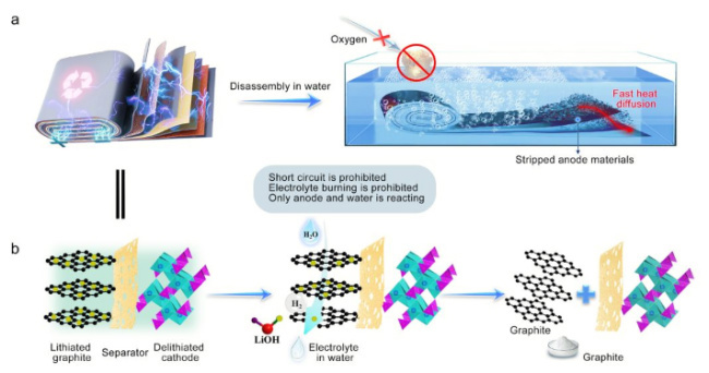 近日,清華大學深圳國際研究生院材料研究院康飛宇教授和李寶華教授團隊合作研究開發出了一套高效綠色回收退役鋰離子電池的有效策略。基于帶電退役電池在水中的精準拆解,結合濕法冶金工藝,完成對廢舊電池中鋰、鐵、磷等單個元素的高效提取。該研究為解決退役鋰離子電池的高效綠色回收和高值化利用問題提供了新思路,有助于推動退役鋰電池回收的工業化進程。