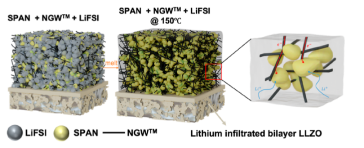 他開發(fā)了一種新穎的三相硫正極,其由硫化聚丙烯腈(sulfurized polyacrylonitrile,SPAN)、熔融雙鋰(氟磺酰)酰亞胺(lithium bis-(fluorosulfonyl)imide,LiFSI)和納米石墨烯線(nano graphene wire,NGW)混合而成。用納米石墨烯線代替?zhèn)鹘y(tǒng)的炭黑,產(chǎn)生了機械強度更高的復(fù)合正極,同時保持了連續(xù)的電子傳導(dǎo)。