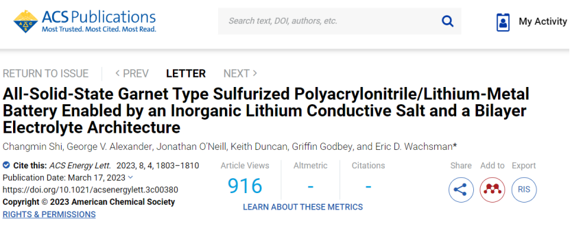 日前,相關(guān)論文以《由無機鋰鹽和雙層電解質(zhì)結(jié)構(gòu)實現(xiàn)的全固態(tài)石榴石型硫化聚丙烯腈/鋰金屬電池》(All-Solid-State Garnet Type Sulfurized Polyacrylonitrile/Lithium-Metal Battery Enabled by an Inorganic Lithium Conductive Salt and a Bilayer Electrolyte Architecture)為題發(fā)表在 ACS Energy Letters 上[1]。