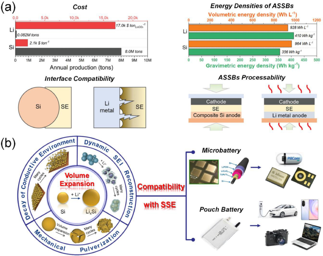 【圖1】(a)硅基和鋰基ASSBs的綜合比較。(b)硅基ASSBs從基礎研究到實際應用的發展。