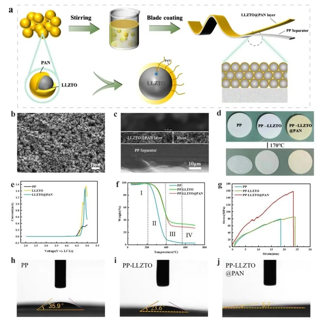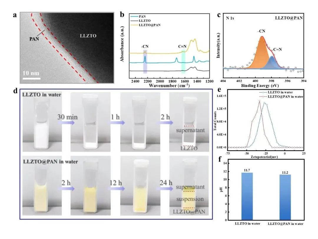 電池先進(jìn)材料聯(lián)合創(chuàng)新實(shí)驗(yàn)室張濤研究員團(tuán)隊(duì)通過(guò)石榴石型固態(tài)電解質(zhì)(LLZTO)與聚丙烯腈(PAN)強(qiáng)極性腈基基團(tuán)(-CN)之間的配位作用構(gòu)建了穩(wěn)固的LLZTO@PAN包覆結(jié)構(gòu)。在此基礎(chǔ)上,利用該功能性材料構(gòu)筑出水基漿料涂覆的表面強(qiáng)極性隔膜。該項(xiàng)工作闡明了固態(tài)電解質(zhì)功能化隔膜與鋰沉積行為之間的構(gòu)效關(guān)系,同時(shí),構(gòu)筑水基漿料涂覆的功能化隔膜也為實(shí)現(xiàn)長(zhǎng)壽命、高安全的高比能鋰金屬