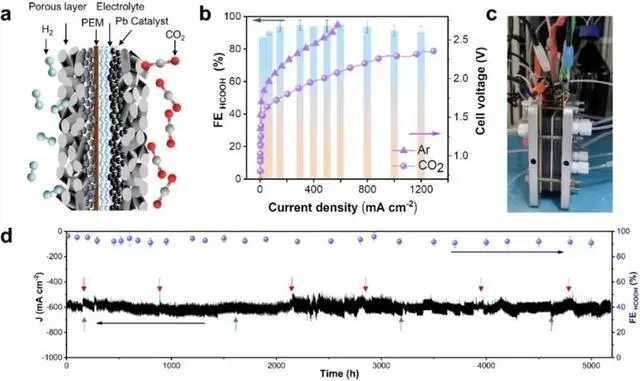 在電解二氧化碳獲得的二十余種產(chǎn)物中,甲酸具有顯著的經(jīng)濟(jì)價(jià)值,在燃料電池、醫(yī)藥領(lǐng)域等都有廣泛用途。高效獲得高純甲酸,不僅能夠消耗二氧化碳,還能創(chuàng)造可觀的經(jīng)濟(jì)效益。夏寶玉團(tuán)隊(duì)朝著這個(gè)研究方向,歷時(shí)近五年,創(chuàng)建了質(zhì)子交換膜二氧化碳電解系統(tǒng),讓甲酸的生成率超過(guò)93%,并能連續(xù)穩(wěn)定運(yùn)行5000小時(shí)以上,在多項(xiàng)指標(biāo)上打破世界紀(jì)錄。