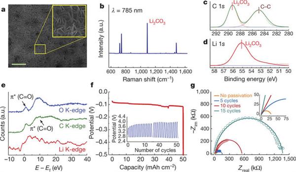 “然而,迄今為止,由于涉及陰極、陽極和電解質(zhì)的副反應(yīng),這樣的系統(tǒng)基本上局限于純氧環(huán)境(鋰-氧電池)并且循環(huán)壽命有限。在存在氮?dú)狻⒍趸己退魵獾那闆r下,這些副反應(yīng)可能變得更加復(fù)雜。此外,由于需要儲(chǔ)存氧氣、鋰-氧體系的體積能量密度對(duì)于實(shí)際應(yīng)用而言可能太小。在這里,我們看到了一個(gè)包含碳酸鋰基保護(hù)陽極,二硫化鉬陰極和離子液體/二甲基亞砜電解質(zhì)的系統(tǒng),該系統(tǒng)在模擬空氣環(huán)境中作為鋰空氣電池工作,循環(huán)壽命長(zhǎng)達(dá)700次。