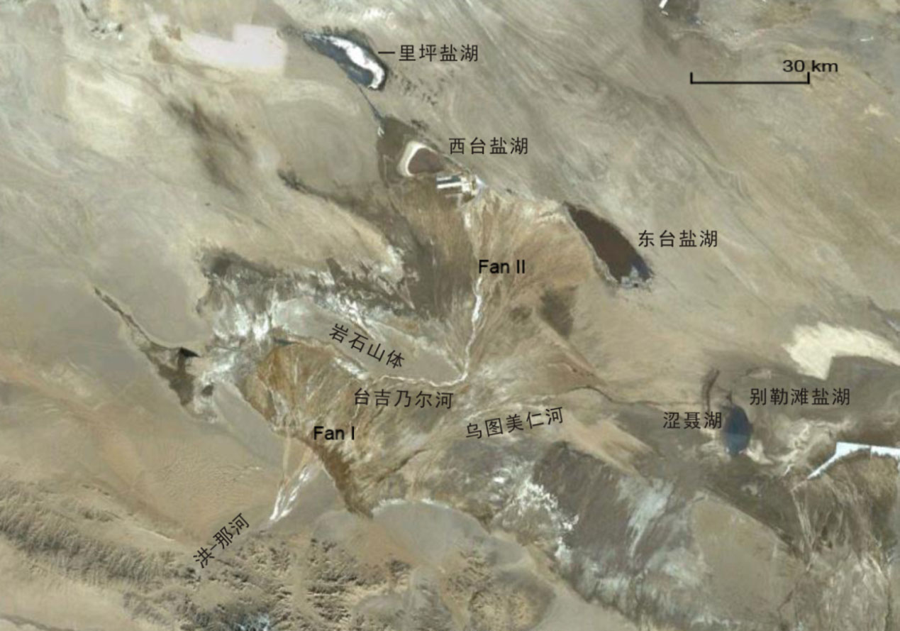 圖2 洪-那河山前沖積扇、扇前河-臺吉乃爾河、臺吉乃爾河沖積扇、烏圖美仁河,以及終端鹽湖——里坪、東臺、西臺、別勒灘(包含澀聶湖)。