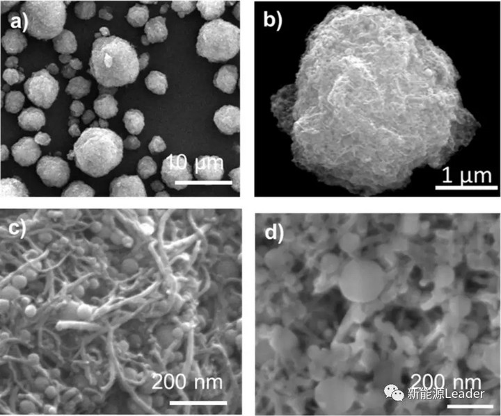 下圖為Byung Hoon Park合成的Si/CNT材料的SEM圖片,從圖中能夠看到Si納米顆粒均勻的分布在CNT組成的網(wǎng)絡之中,碳納米管之間仍然保持著均勻分布的微孔,能夠為Li+的擴散提供充足的通道。900℃高溫處理過程中蔗糖被高溫碳化,成為連接Si與CNT、CNT與CNT的粘結劑。