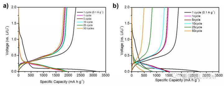 下圖a為上述過程制備的Si/CNT/C材料的充放電曲線,從圖中能夠看到在0.1A/g的電流密度下Si/CNT/C材料的首次充電容量可達3152mAh/g,放電容量為2302mAh/g,首次庫倫效率約為73%左右。在1A/g的電流密度下Si/CNT/C材料的容量仍然可以達到1989mAh/g,并且在50次循環(huán)中幾乎沒有衰降。下圖b為沒有加入蔗糖的Si/CNT材料的充放電曲線,從圖中我們能夠看到Si/CNT材料的首次放電容量僅為1537mAh/g,而且其容量在循環(huán)過程中衰降非常快,在1A/g的電流密度下經(jīng)過50次循環(huán)后材料的容量就從最初的1500mAh/g左右,下降到了500mAh/g。