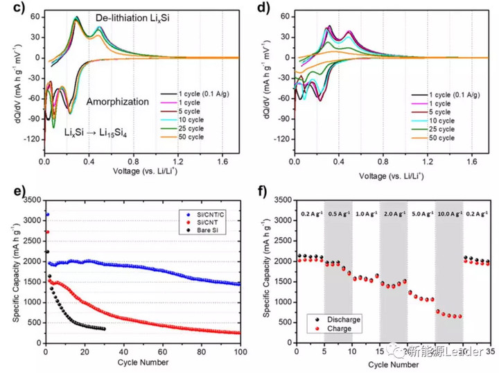 為了研究Si/CNT/C(下圖c)和Si/CNT(下圖d)兩種材料不同循環(huán)性能的原因,Byung Hoon Park繪制了兩種材料在不同循環(huán)次數(shù)時的dQ/dV曲線,從圖中能夠看到在嵌鋰的過程中兩種材料都出現(xiàn)了兩個峰,分別在0.23V和0.08V,這兩個峰分別對應著Si的無定形化(0.23V)和無定形LiXSi向Li15Si轉(zhuǎn)變(0.08V)兩個反應。脫鋰過程中也分別在0.3V和0.49V出現(xiàn)兩個峰,分別對應的為LiXSi去合金化(0.3V)和Li15Si去合金化(0.49V)轉(zhuǎn)變?yōu)镾i的兩個反應。從不同循環(huán)次數(shù)的dQ/dV曲線上,我們能夠看到Si/CNT/C材料在50次循環(huán)中氧化和還原峰的強度基本上能夠保持不變,表明材料中的Si顆粒與CNT之間接觸的非常良好。而Si/CNT材料材料在經(jīng)過循環(huán)后,其氧化和還原峰的強度出現(xiàn)了大幅度的下降,表明循環(huán)的過程中由于巨大的體積膨脹導致Si顆粒與CNT導電網(wǎng)絡之間出現(xiàn)了接觸不良。Si/CNT/C材料的穩(wěn)定的結構使得其具有非常優(yōu)異的循環(huán)性能,從下圖e中能夠看到在前50次循環(huán)中電極Si/CNT/C材料的容量幾乎沒有衰降(電流密度為1A/g),在100次循環(huán)后容量保持率仍然可達70%,而Si/CNT和單質(zhì)Si材料的循環(huán)性能要遠遠低于Si/CNT/C材料。