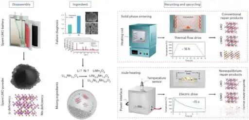 鋰離子電池被廣泛應用于諸多領域,但其有限的使用壽命帶來了資源緊張和環境風險等挑戰,因此廢舊鋰離子電池的回收已然成為學術界和產業界關注的焦點。與從廢舊電池中提取關鍵金屬的傳統冶金方法不同,直接回收工藝可以修復受損材料,并通過有效的處理最大限度地運用其價值。然而,現有直接回收方法依賴長時間加熱以實現失效結構的重排。同時,鋰離子電池的性能基準不斷提升,即使廢舊鋰離子電池直接再生能夠恢復其原始性能,往往也會與最新的市場要求存在差距,這兩大問題對直接回收技術的發展與應用提出了全新挑戰。