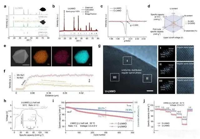 以失效錳酸鋰(LiMn2O4)材料為例,研究構建了連續相轉變的路徑,展示了將其單步超快升級為下一代高性能鋰離子電池正極材料的有效性與通用性。升級產物包括高壓快充型鎳錳酸鋰(LiNi0.5Mn1.5O4)正極材料和高能量密度型無鈷富鋰錳基層狀氧化物(Li1.2Ni0.2Mn0.6O2)正極材料等,從而將整體經濟效益較直接修復提高3~5倍。更重要的是,得益于超快非平衡反應過程,有效調控了鋰離子、過渡金屬離子及空位缺陷的遷移與重排行為,成功在材料中引入元素梯度分布及適量的有益結構缺陷,再生產物的循環穩定性及快速充放性能超越了同類商業正極材料。