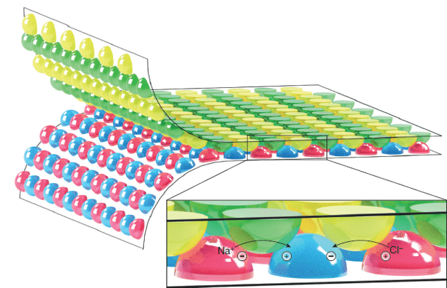 紅色凝膠含有鹽水,而藍色凝膠含有淡水。離子原本會從紅色凝膠流向藍色凝膠,但由于基板的間隔,無法出現這樣的流動。與此同時,與這塊基板對應的另一塊基板上布置了綠色和黃色凝膠,當它們橋接在藍色和紅色凝膠之間的空隙時,就能為離子運動提供通道。 紅色凝膠含有鹽水,而藍色凝膠含有淡水。離子原本會從紅色凝膠流向藍色凝膠,但由于基板的間隔,無法出現這樣的流動。與此同時,與這塊基板對應的另一塊基板上布置了綠色和黃色凝膠,當它們橋接在藍色和紅色凝膠之間的空隙時,就能為離子運動提供通道。