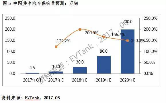 在中國市場,EVTank在研究報告中認為中國汽車共享市場正處于產業發展初期,且已經呈現出巨大的市場發展潛力。截止到2017年Q1,EVTank的統計數據顯示,國內在運營的共享汽車已經達到4.5萬,以新能源汽車為主。EVTank預計到2020年,國內共享汽車的運營車輛累計將達到200萬輛,成為全球最大的共享汽車市場。