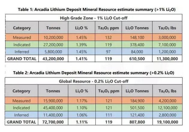 前景資源公司的阿卡迪亞項目是目前非洲最大的定義JORC資源量的鋰礦項目,含7200萬噸@1.11%的LiO2(以0.2%LiO2為邊界)或4320萬噸@1.41%LiO2(以1%LiO2為邊界);其中探明和名直接別的資源量為3740萬噸@1.41%LiO2(以1%LiO2為邊界);合計含LiO2約81萬噸,2百萬噸等量碳酸鋰(LCE)。
