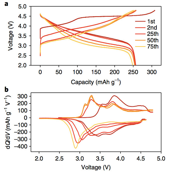 從上面的分析不難看出,富鋰材料在循環中錳和鈷元素增加的容量彌補了鎳和氧元素損失的容量,使得富鋰材料的整體容量沒有太大的變化,但是這些容量的組成部分卻發生了翻天覆地的變化,從氧和鎳的氧化還原反應轉向錳、鈷的氧化還原反應會明顯的改變富鋰材料的電壓特性。這一點也可以從費米能級圖中得到解釋,在開始的時候,富鋰材料的費米能級僅僅稍高于Ni2+/Ni3+,因此富鋰材料與金屬鋰之間的電位差比較高,但是隨著循環的進行,富鋰材料表面的氧發生了還原和析出,因此導致過渡金屬元素的價態降低,而表層的Ni元素會被首先還原,在材料的表面形成一層沒有活性的巖鹽結構,導致鎳元素提供的容量減少。而Mn和Co元素的還原則使得兩者分別發生Mn3+/Mn4+ 和Co2+/Co3+,從而使得費米能級顯著提高,從而導致開路電壓的降低。