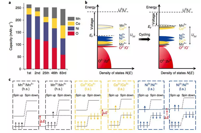 通過對上述的XAS數據半定量分析,EnyuanHu得到了在1、2、25、46和83次循環時富鋰材料中不同元素對材料整體容量的貢獻(如下圖a所示),從圖中可以看到在首次循環時氧和鎳供應了主要容量,分別達到128mAh/g和94mAh/g。但是隨著循環的進行,氧和鎳元素提供的容量迅速減少,在83次循環時,氧元素提供的容量僅為50mAh/g,鎳元素提供的容量也下降到了66mAh/g。但是錳和鈷元素貢獻的容量卻隨著循環次數的增加而增加,例如第一次放電時錳、鈷提供的容量分別14mAh/g和26mAh/g,但是隨著循環到83次時,兩者的容量分別增加到了66mAh/g和53mAh/g。